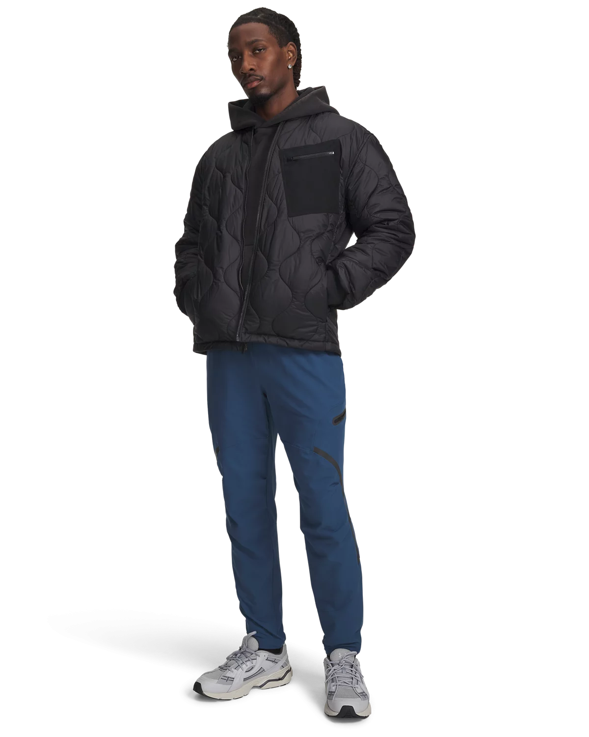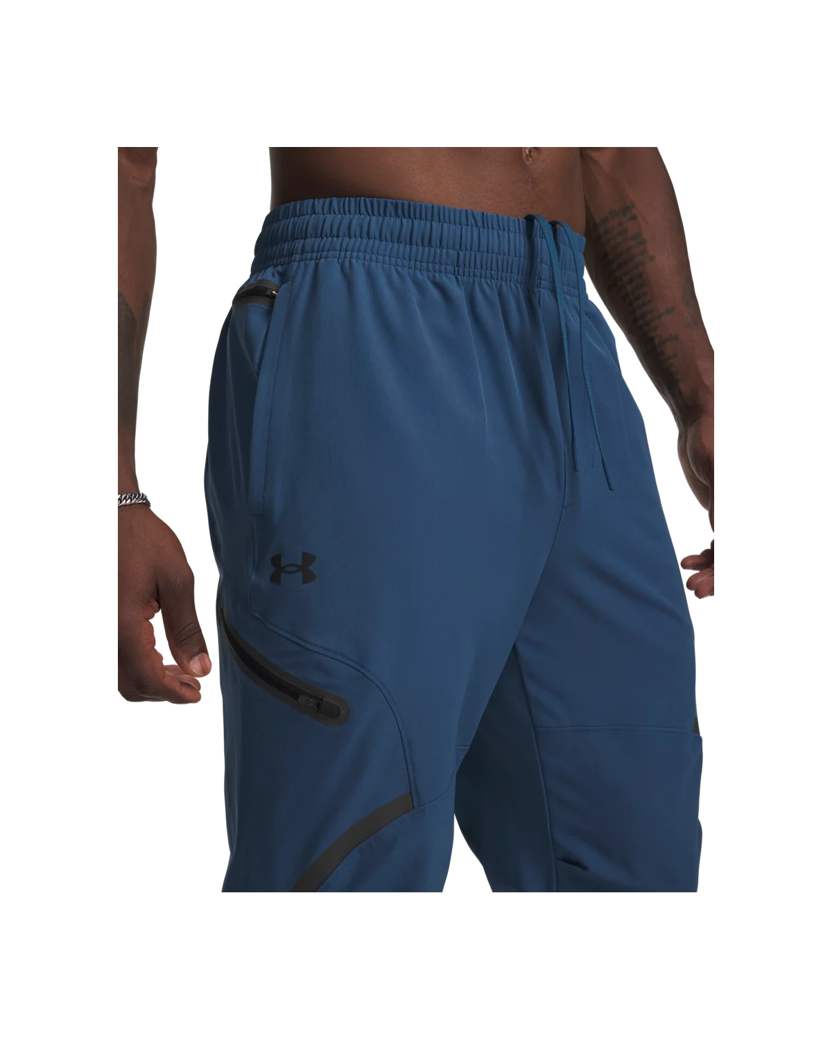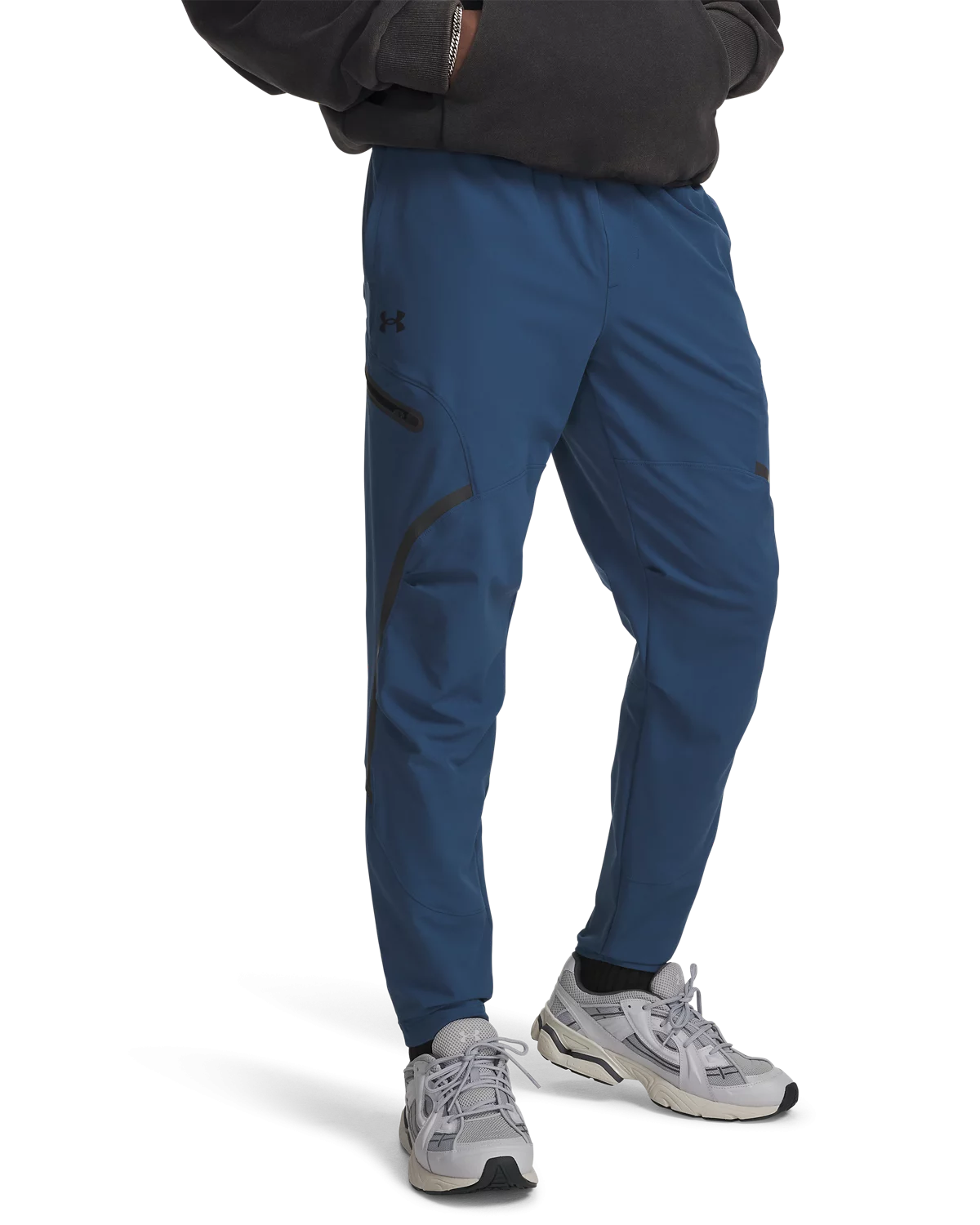 开放式插手口袋右侧UA Strength拉链口袋与工装拉链口袋,方便携带随身物品。