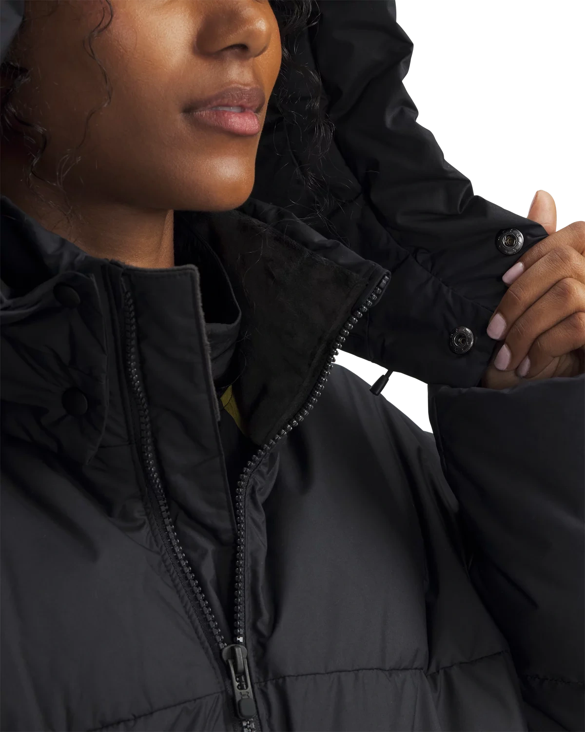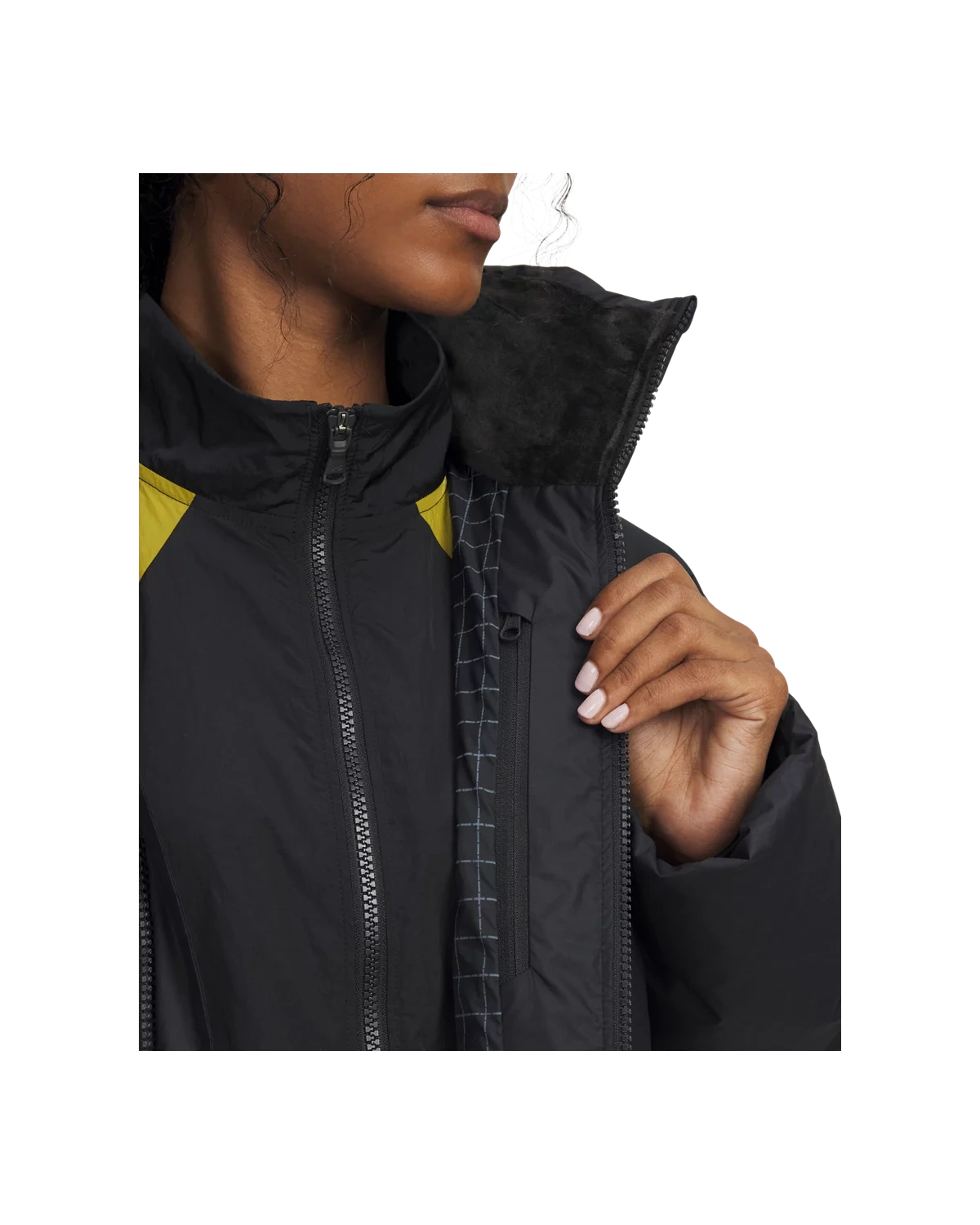领口配有抓绒内衬,有助于提升温暖与舒适度。