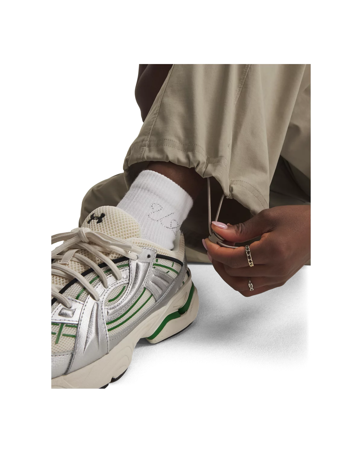 裤脚处束绳调节设计,可自由调节松紧,适配不同造型。