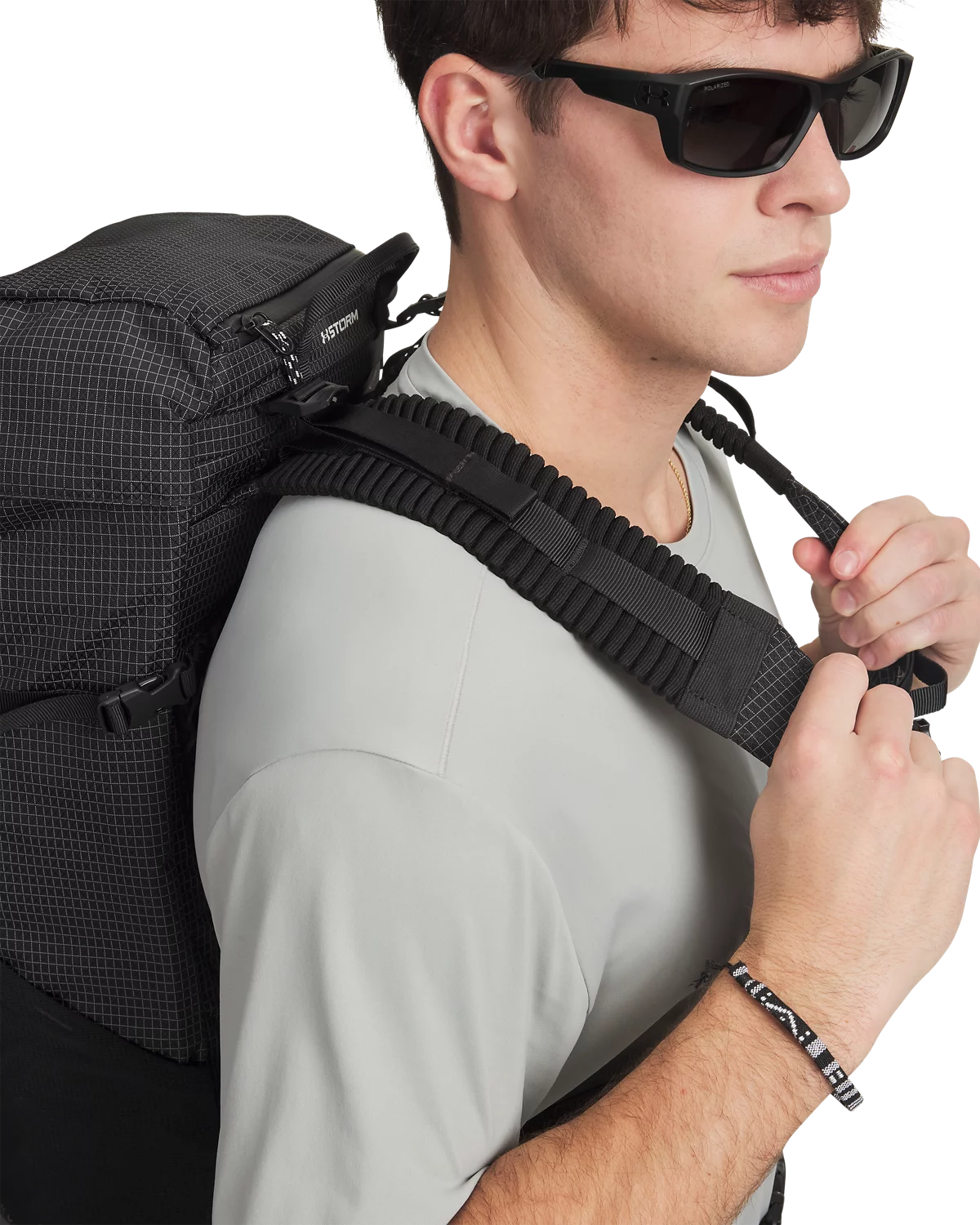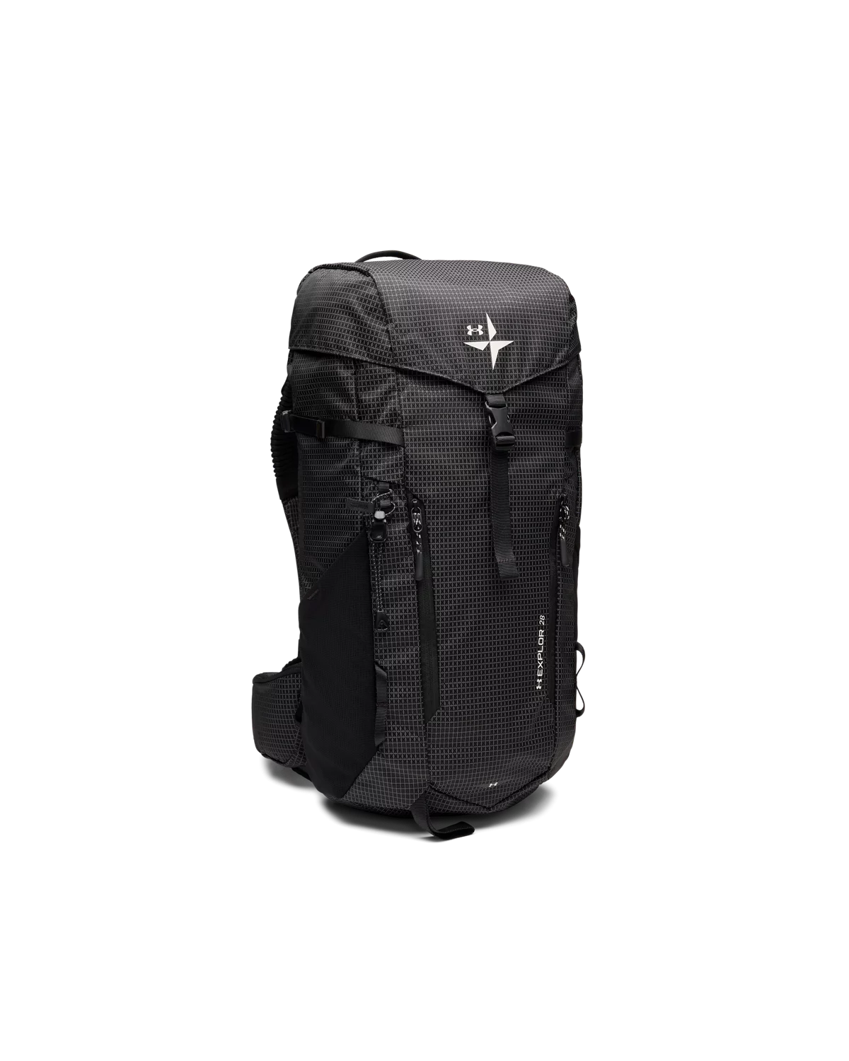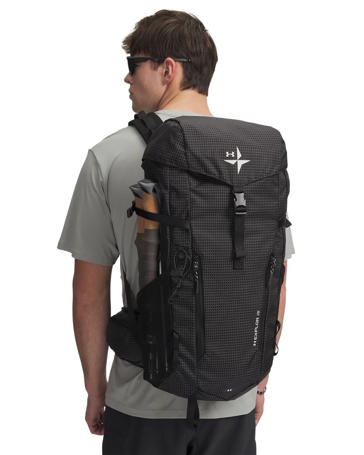 格纹尼龙面料,搭配加厚透气网眼背板,干爽舒适,适合户外运动时背携。